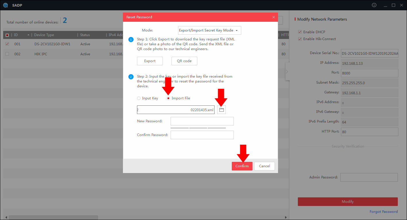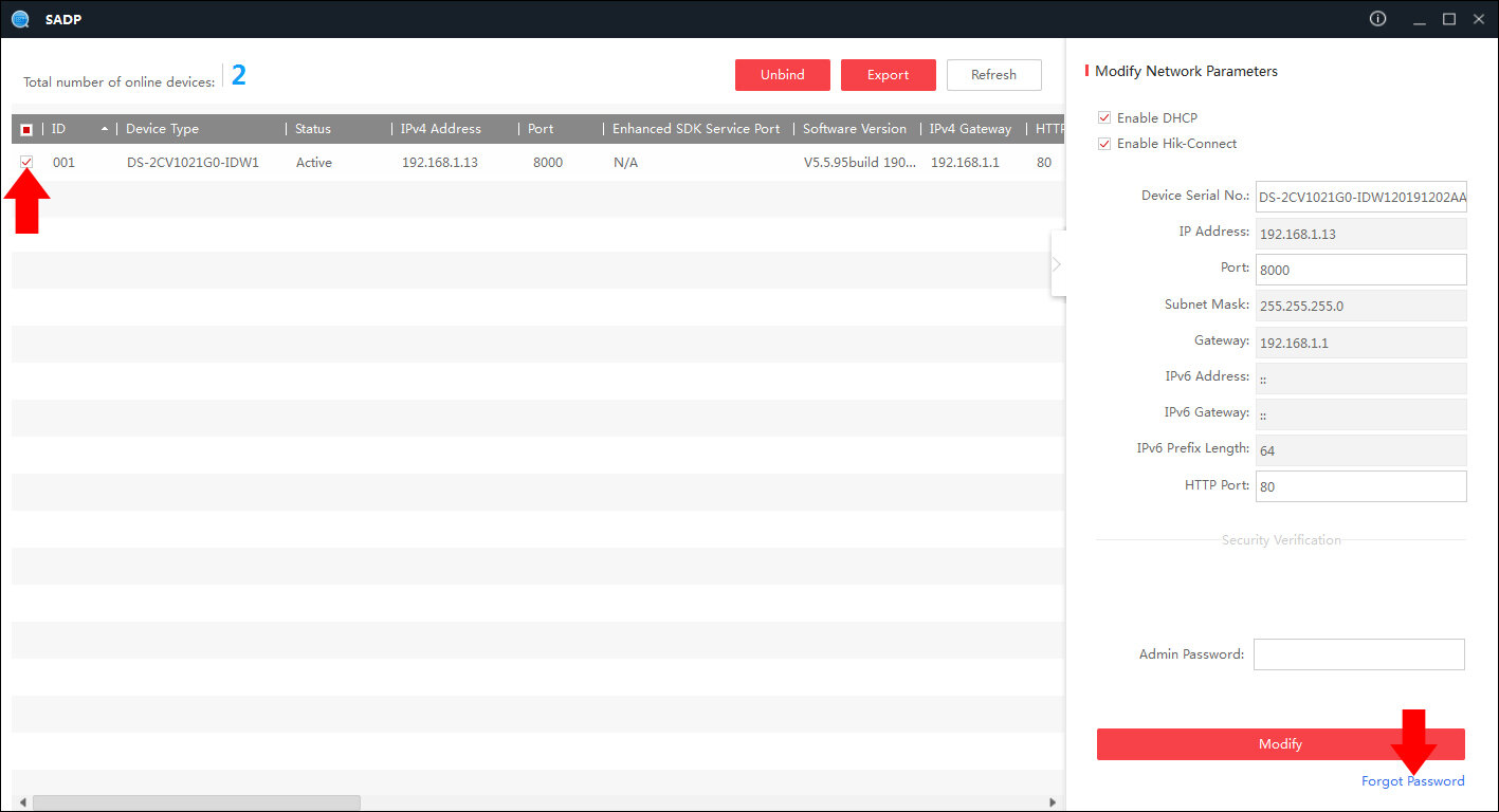 Reset hasła urządzenia poprzez aplikację na system windows SADP Tool