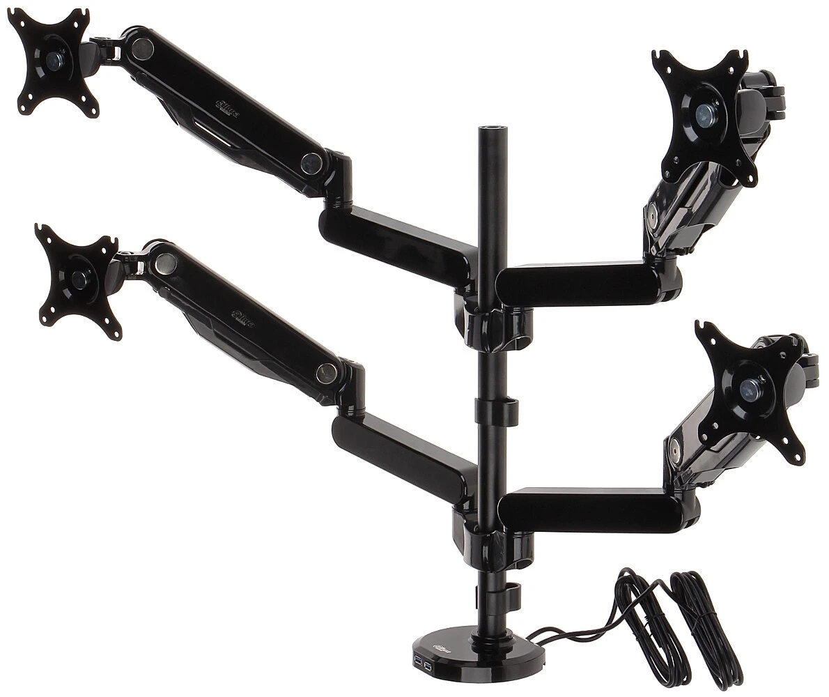 Uchwyt BL304-G umożliwia mocowanie 4 monitorów LCD do blatu, lub innych powierzchni płaskich Uchwyt umożliwia łatwą regulację pochylenia panelu w pionie oraz obrotu w poziomie