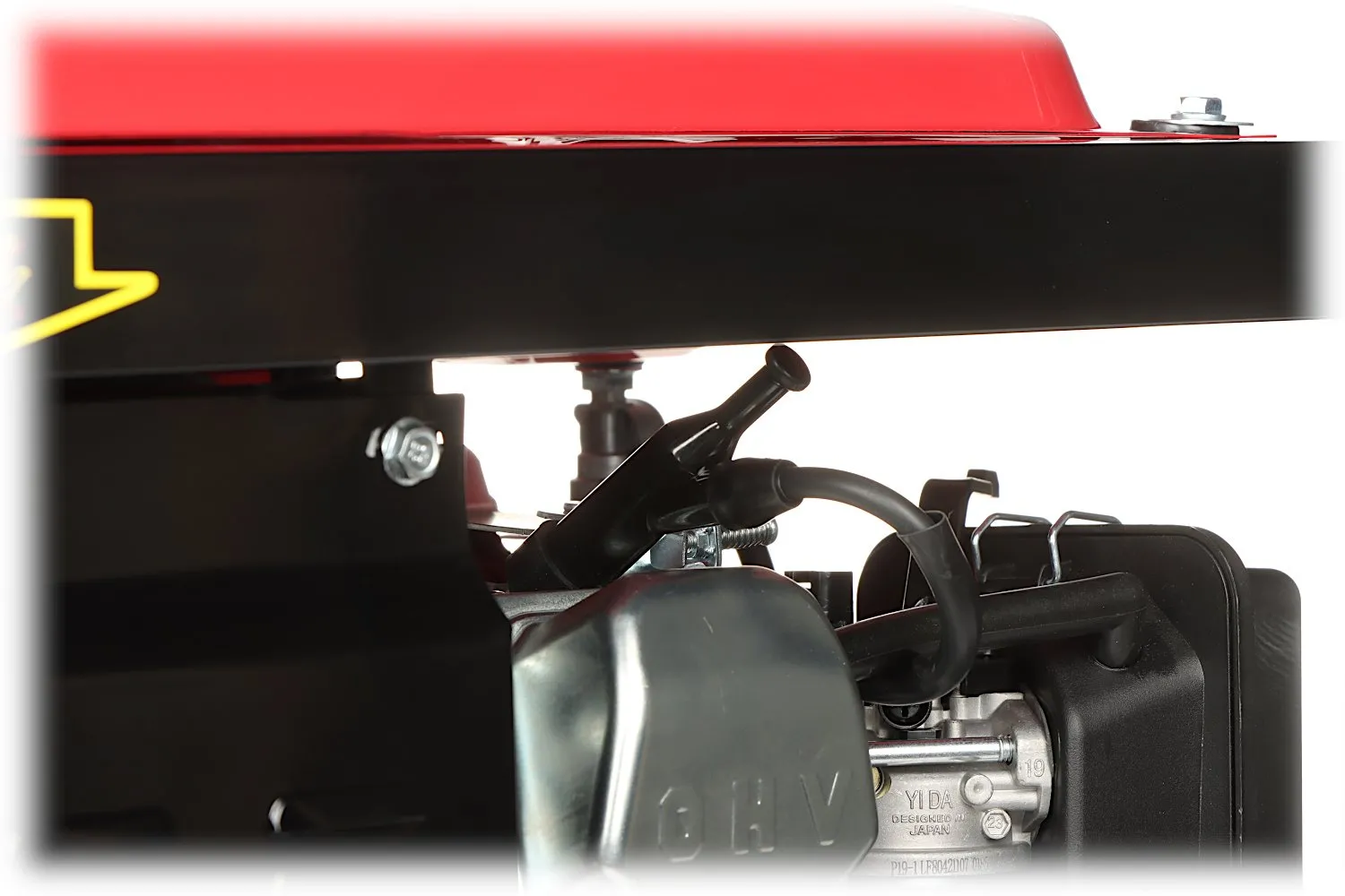 Silnik 7 KM (210 cm³) pracuje równo, a panel zapewnia wygodne podłączenia; dodatkowe gniazdo „trójfazowe” udostępnia tylko jedną fazę – przydatne jako alternatywny punkt poboru 230 V. O bezpieczeństwo dba AVR i czytelny woltomierz, a solidna rama (565×430×430 mm, 92 dB) w kolorze czerwony + czarny ułatwia transport i codzienną eksploatację.