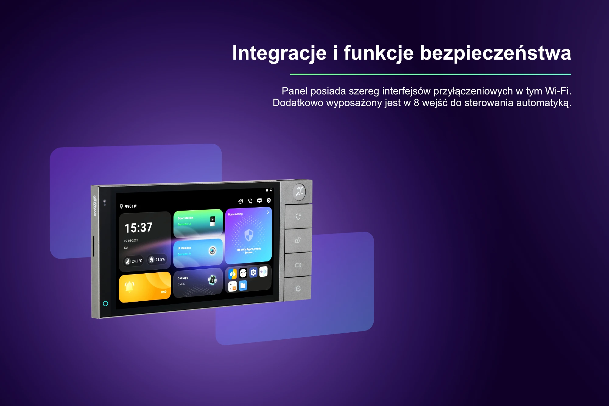 - Funkcje i integracje: alarm, DND, interkom, dzwonek, rekordy zdarzeń, sterowanie windą + 8/1 I/O, RS-485, USB-C, wyjście 12 V