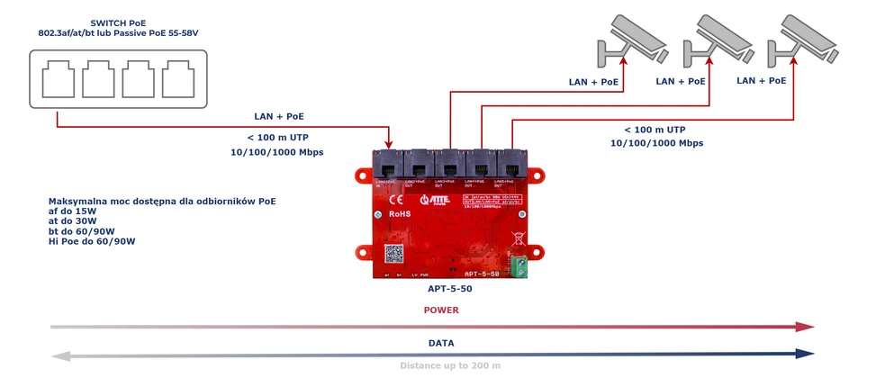 APT-5-50 jest gigabitowym przełącznikiem sieciowym PoE mającym możliwość pracy jako extender (repeater) sieci LAN oraz zasilania PoE. Najczęściej stosowany w sytuacjach, gdy na jednym przewodzie UTP potrzebujemy uruchomić kilka urządzeń sieciowych (np. kilka kamer IP) lub gdy niezbędne jest dodatkowe odgałęzienie sieciowe. Urządzenie umożliwia nam zasilanie do 4 odbiorników PoE za pomocą jednego przewodu UTP. W sytuacjach, kiedy nie mamy możliwości doprowadzenie nowego przewodu lub doprowadzenie wiązałoby się z dodatkowymi kosztami, APT-5-50 pozwala nam na wykorzystanie istniejącego już okablowania. APT-5-50 może pełnić rolę ekstendera sieci LAN + PoE w sytuacji, kiedy odległość pomiędzy urządzeniami przekracza 100m. Jeżeli jest możliwość podzielenia przewodu na odcinki poniżej 100m przewodu UTP pozwala na zwiększenie zasięgu sieci LAN bez konieczności podłączenia dodatkowego zasilania z zachowaniem pełnej przepustowości 1000Mbps.Podstawowe zastosowania: