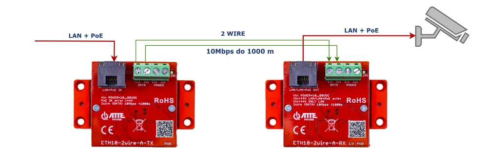 ETH10-2wire-A-SET to zestaw aktywnych konwerterów do transmisji danych sieci Ethernet oraz zasilania PoE z wykorzystaniem 2 przewodów np. jednej pary skrętki UTP. Zestaw umożliwia montaż kamer lub innych urządzeń IP PoE w miejscach, gdzie wymiana istniejącego okablowania jest niemożliwa bądź nieopłacalna. Charakteryzuje się wysoką odpornością na zakłócenia zewnętrzne.