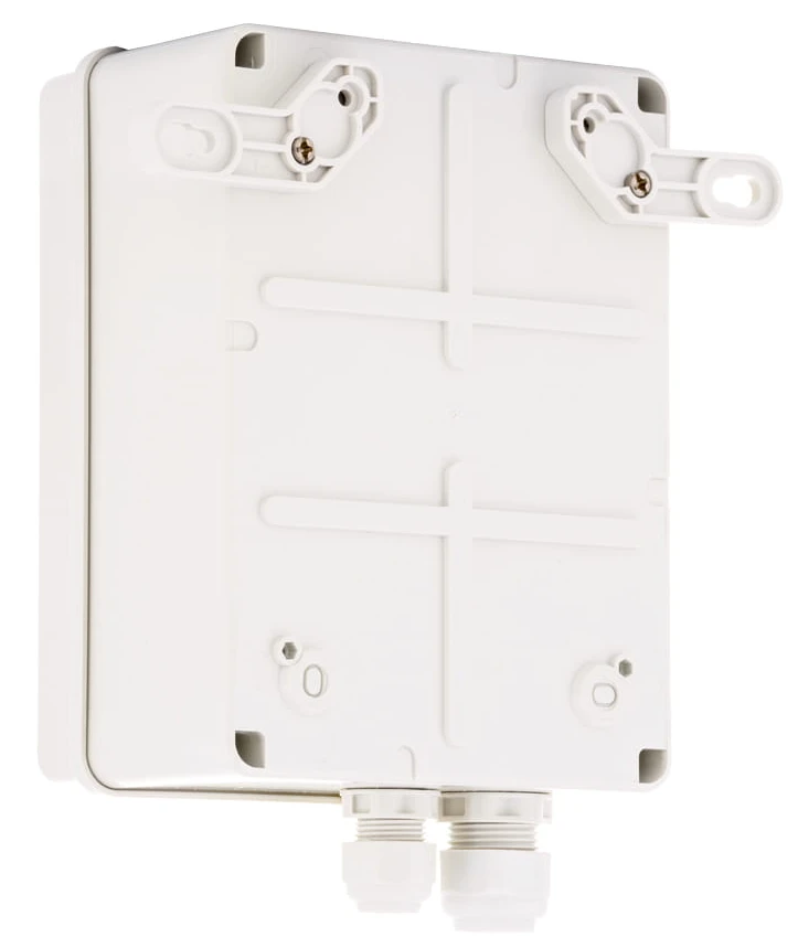 - Obudowa IP56 ABOX-S1 – -25…+50°C, 110 × 150 × 70 mm, 0,42 kg, tworzywo szare, dławnice 1×M16 + 1×M20, montaż naścienny na uchwytach.